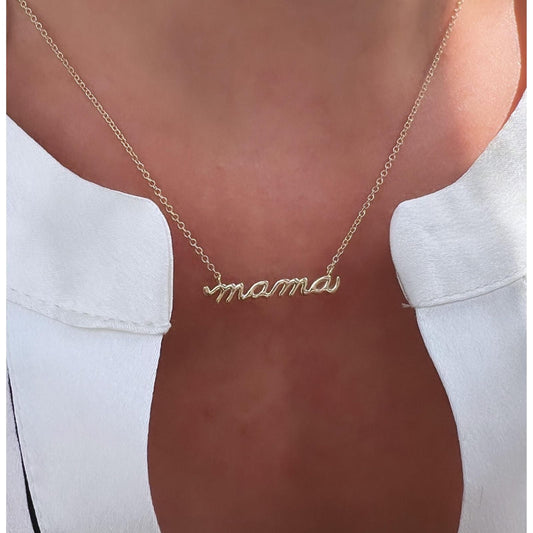 14K Gold and Diamond Dainty "mama" Script Necklace
