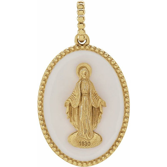 14K Gold White/Black Enameled Miraculous Medal Pendant