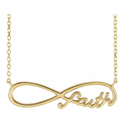 Symbolize your eternal trust with the 14K Gold Faith Infinity Necklace. Featuring the timeless infinity symbol intertwined with the word "Faith," this piece is an elegant reminder of the enduring power of belief. Crafted from high-quality 14K gold, this necklace is designed for both daily wear and special occasions, offering a sophisticated look that carries a deeper meaning.