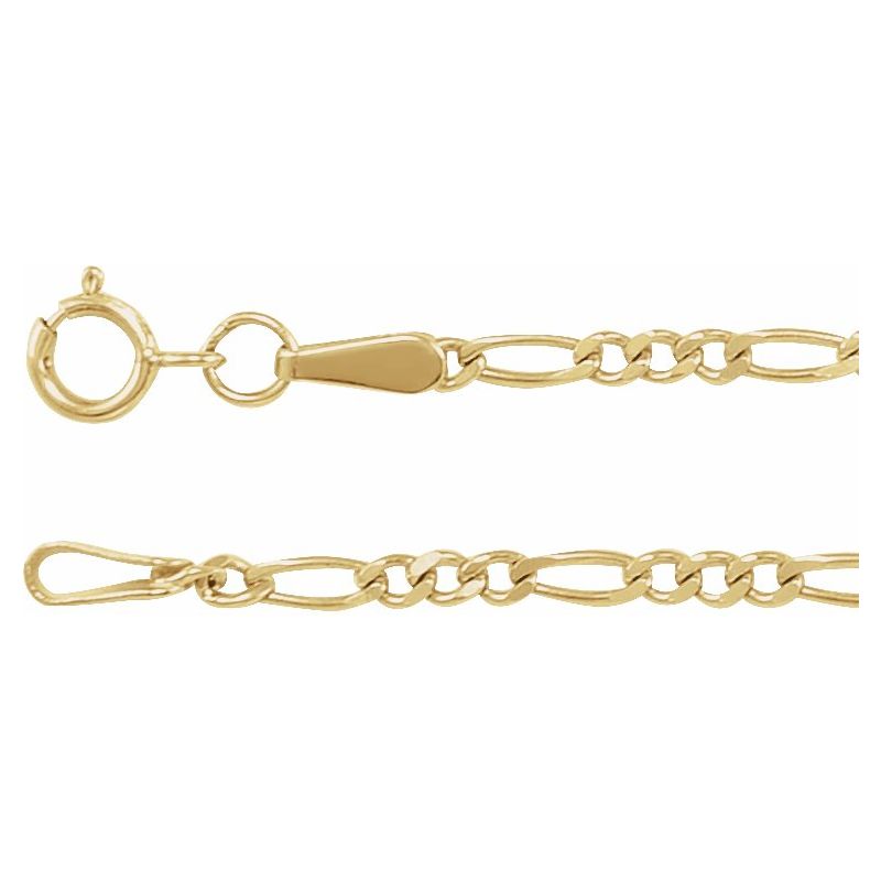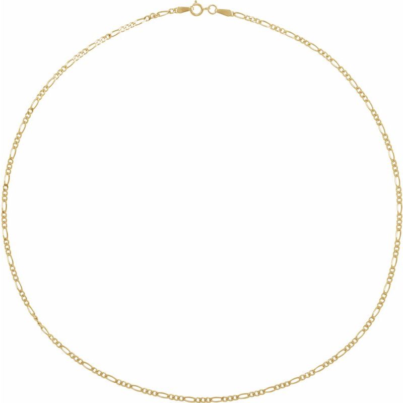 The 14K Yellow Gold 1.9 mm Diamond-Cut Figaro Chain is a perfect fusion of classic design and modern elegance. Crafted from high-quality 14K yellow gold, this chain features the iconic Figaro link pattern, alternating between short and elongated links. The diamond-cut finish adds a brilliant sparkle, catching the light beautifully with every movement.